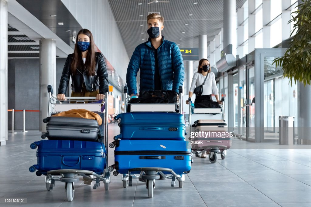 People traveling by plane during COVID 19, wearing N95 face masks, carrying luggage in airport terminal.